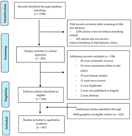 The inclusion criteria set by the authors for the selection of studies were as follows: (1) Only research articles; (2) research on tobacco/smoking in a WHO African region country; (3) non-tobacco industry-sponsored studies or trials; and (4) completed studies. The exclusion criteria were as follows: (1) not tobacco-related; (2) health outcome studies where tobacco was only one of the risk factors considered; and (3) substance abuse studies where tobacco was not the main focus of the study. Two research assistants extracted data from the 447 studies that met the eligibility criteria, independently (Table S1). A predefined form was used for data extraction. Data extracted included author, study site, year of publication, area of research, sample size, sample characteristics, type of sampling, mean age of sample, sex distribution, place of recruitment, location, study design, type of study design, data characteristics, power, eligibility criteria, and use of Global Youth Tobacco Survey (GYTS). Discrepancies in data extracted by the two research assistants were resolved through discussion with the lead author to reach a consensus. Consistent with PRISMA [69], the workflow is presented in Figure 1.