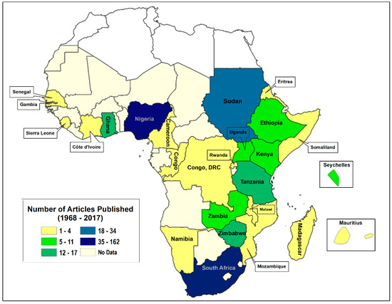 Distribution of peer-reviewed tobacco control publications in Sub-Saharan Africa (up to February 2017; n = 447).