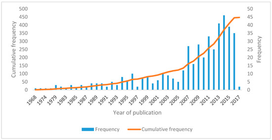 From 1968 to 1991 only one to four articles were published every year, except 1969, 1971–1973, 1975, 1977, 1978, 1980, and 1981 when no article on tobacco was published from the SSA region. The number of peer-reviewed publications was highly sporadic and slow until the early 2000s when it started to increase. In particular, after WHO FCTC was adopted, the number of publications increased dramatically. Indeed, between 2006 and 2016 the cumulative number of publications over the 11-year period was 322. Overall, the largest number of articles (46) was published in 2014. While only 111 articles were published from the year 1968 to 2003 (36 years), a greater number of articles was published (336) from 2004 to 2017 (14 years).