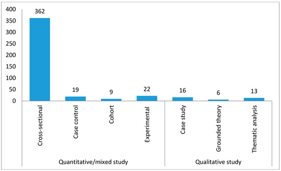 The broad types of scientific inquiries are quantitative, qualitative, and mixed methods [61,62]. Of the 447 peer-reviewed articles, 91.28% (n = 408) were quantitative studies, while 7.83% (n = 35) were qualitative studies, and the remaining 0.89% (n = 4) used mixed methods (Figure 2). Thus, scientific inquiry pertaining to tobacco control research in SSA has been mainly based on quantitative method or approach.