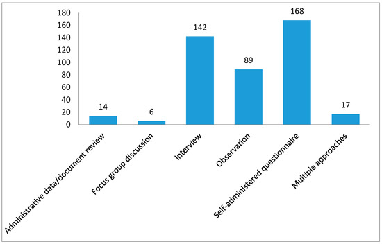 The rigor of a scientific study depends on the way data are acquired or collected from the study participants. We were able to retrieve information on the underlying data characteristics for 436 peer-reviewed publications in SSA. Of these 436 publications, the majority of the studies (n = 168, 38.53%; Figure 5) were generated through self-administered questionnaires, followed by interviews (n = 142, 32.57%). Observation methods were also commonly used to collect information (n = 89, 20.41%). Other studies used data from administrative records/documents (n = 14, 3.21%) and focus group discussions (n = 6, 1.38%). Seventeen studies (390%) used multiple approaches to generate data for their studies.