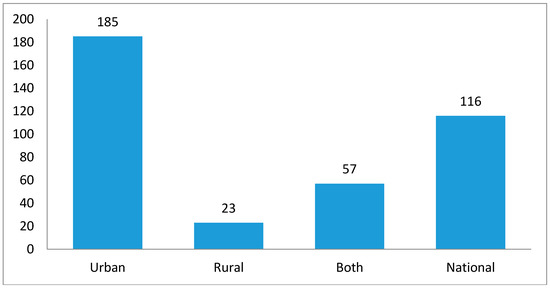 Data on location of the study population were retrieved for 381 publications (85.23%; Figure 6). Among those studies, 185 (48.56%) were conducted in urban settings, 23 (6.04%) were in rural settings, and 57 (14.96%) represented both urban and rural settings. Additionally, 116 (30.45%) of the publications used national level data.