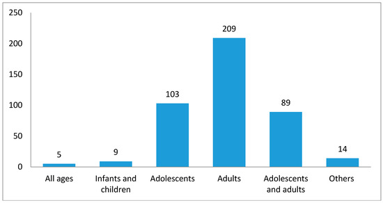 Study population could be characterized for 429 studies. Out of these studies, the majority of the studies were undertaken among adults (n = 209, 48.72%; Figure 7), followed by adolescents (n = 103, 24.01%; Figure 6). Only nine studies were completed among infants and children (2.10%). Five studies (1.17%) used all age groups, while 89 (20.75%) were based on both adolescents and adults. Additionally, 14 studies (4.04%) collected data from non-human subjects (e.g., cigarettes, snuffs, and documents).