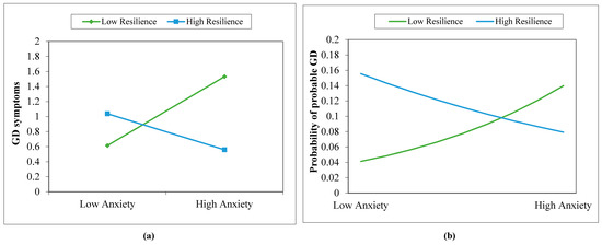 Table 2 presents the results of the analyses regarding the potential moderating effects of psychological resilience and purpose in life on the associations between GD (i.e., GD symptoms and probable GD) and each of the three comorbid disorder symptoms in the study. As shown, one set of six independent moderation models was built to assess the six product terms (i.e., depression symptoms × purpose, depression symptoms × resilience, anxiety symptoms × purpose, anxiety symptoms × resilience, IGD symptoms × purpose, and IGD symptoms × resilience) in moderating between symptoms of depression/anxiety/IGD and GD symptoms. Similarly, another set of six models was examined for probable GD. The results showed no statistical significance for most of the interaction terms, with the exception of anxiety symptoms × resilience, which displayed a consistent moderating effect on the relationship between anxiety and GD symptoms (R2Change = 0.035, Fchange (1,162) = 6.29, p = 0.01) and between anxiety and probable GD (χ2(1) = 4.30, p = 0.04), respectively. We further probed these moderating effects with a simple slopes analysis [48,49], and the results are presented in Figure 1.