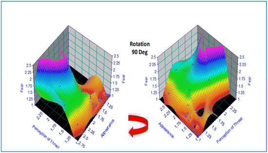 36]. An alternative function approximation is possible by ANN but was not used on this occasion due to the small sample size. This would have involved a least-squares error regression analysis with model predictions plotted incrementally along each axis. In the present case, data visualization was accomplished by color coding (where the numerical scale was mapped linearly onto a color scale) followed by a 90 Deg clockwise rotation, revealing two hidden areas of zero-fear response under certain combinations of appearance and perception of threat (e.g., animals that are perceived to be dangerous but are dead or disabled).