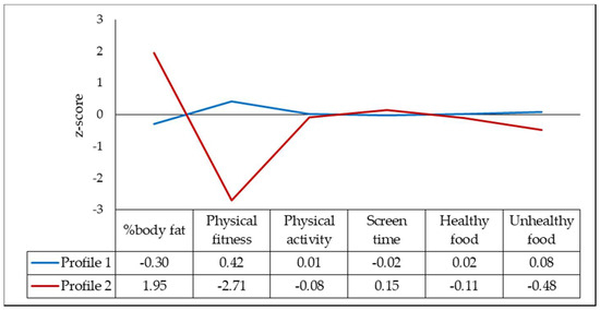 Figure 1 illustrates the best profile solution merging lifestyle behaviors (physical activity, screen time, and healthy/unhealthy food) and biological markers (physical fitness and body fat). Based on the statistical tests previously mentioned (AIC, BIC, and the Vuong–Lo–Mendel–Rubin likelihood ratio test) (Table 2), a two-latent profile model best fitted the data, and the counts and percentages of individuals in each profile were: Profile 1, n = 638 (86.7%), and Profile 2, n = 98 (13.3%). We labeled Profile 1 (our reference profile) as “fit, lower fat, and poorer diet” and Profile 2 as “higher fat and lower fit, but better diet”.