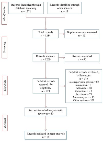 The total number of records identified through database searching was 1271, in addition, records identified through other sources was 13, total records 1284. A total of 15 duplicate records were removed, 1269 total records were screened, and 450 records were excluded. A total of 819 full-test records assessed for eligibility were analyzed. We excluded 779 for following reasons: 82 records because they were case reports/case series, 11 were comments, 10 were editorials, 7 clinical guidelines, 79 were systematic reviews, 13 were meta-analyses that did not include cross-sectional studies on risk factors, 577 were about other topics. A total of 40 papers were considered for systematic review (Figure 1) [4,9,10,11,12,13,15,16,17,18,33,34,35,36,37,38,39,40,41,42,43,44,45,46,47,48,49,50,51,52,53,54,55,56,57,58,59,60,61,62].