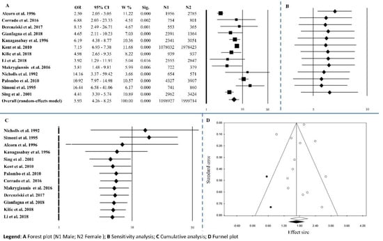 Thirteen studies, among those selected, reported information on males versus females. The overall effect size was OR = 5.93 (4.26–8.25), p < 0.0001, with Q = 132.89, I2 = 90.97, p < 0.0001 (Figure 2A and Table 2). Sensitivity analysis shows an equal trend among studies (Figure 2B). Cumulative analysis indicated that all the studies agreed except for Nicholl’s [51] and Simoni’s [36] (Figure 2C). Although publication bias analysis, by the trim and fill method filled two studies (Figure 2D), the results of Egger’s linear regression test and Begg’s and Mazumdar’s rank correlation tests were not statistically significant (p = 0.339 and p = 0.542, respectively) (Table 2). Meta-regression analysis was not statistically significant p = 0.058.