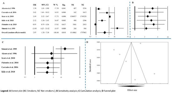 Six papers reported information about smoking habits. The overall effect size was OR = 2.97 (1.20–7.30), p = 0.018, with Q = 390.71, I2 = 98.72, p < 0.0001 (Figure 3A and Table 2). Sensitivity analysis showed an unequal trend among studies (Figure 3B). Cumulative analysis indicated that all the studies agreed except for Simoni’s [36] (Figure 3C). Publication bias analysis by the trim and fill method did not involve the exclusion of any papers (0 filled studies) (Figure 3D). The absence of publication bias is underlined by the results of Egger’s linear regression test and Begg’s and Mazumdar’s rank correlation tests that were not statistically significant (p = 0.229 and p = 0.573, respectively) (Table 2). Meta-regression analysis was not statistically significant p = 0.633.
