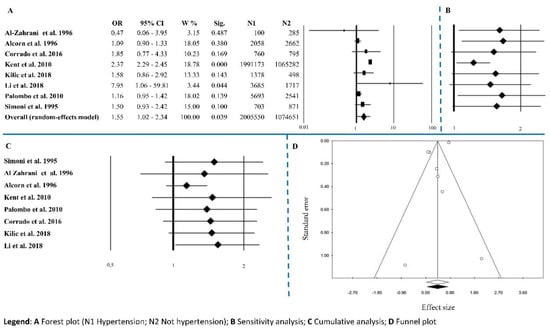 Eight papers contained frequencies on hypertension. The overall effect size was OR = 1.55 (1.02–2.34), p = 0.039, with Q = 112.34, I2 = 93.77, p < 0.0001 (Figure 4A and Table 2). Sensitivity analysis showed an equal trend among studies except for Kent’s [55] (Figure 4B). Cumulative analysis indicated that all the studies agreed except for Alcorn’s [57] (Figure 4C). Publication bias analysis by the trim and fill method did not exclude any papers (0 filled studies) (Figure 4D). The absence of publication bias is highlighted from results of Egger’s linear regression test and Begg’s and Mazumdar’s rank correlation tests that were not statistically significant (p = 0.127 and p = 0.322, respectively) (Table 2). Meta-regression analysis was not statistically significant p = 0.202.
