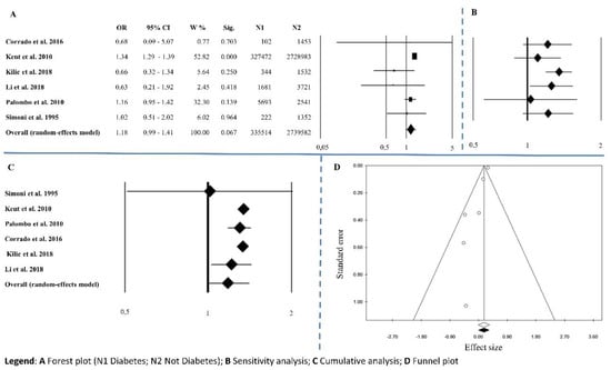 Six papers reported information on diabetes mellitus. The overall effect size was OR = 1.18 (0.99–1.41), p = 0.067, with Q = 8.45, I2 = 40.85, p = 0.133 (Figure 5A and Table 2). Sensitivity analysis showed an unequal trend among studies (Figure 5B). Cumulative analysis indicated that all the studies agreed except for Simoni’s [36] (Figure 5C). Publication bias analysis by the trim and fill method did not involve the exclusion of any papers (0 filled studies) (Figure 5D). According to Egger’s linear regression test (p = 0.008) there is bias, but Begg’s and Mazumdar’s rank correlation tests (p = 0.851) do not show presence of publication bias (Table 2).