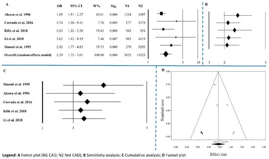 Information on Coronary Artery Disease was reported in 5 studies. The overall effect size was OR = 2.29 (1.75–3.01), p < 0.0001, with Q = 5.98, I2 = 33.15, p = 0.200 (Figure 6A and Table 2). Sensitivity analysis showed an equal trend among studies except for Alcorn’s and Kilic’s [12,57] (Figure 6B). Cumulative analysis indicated that all the studies agreed except for Simoni’s [36] (Figure 6C). Publication bias analysis, by the trim and fill method, filled two studies (Figure 6D). The results of Egger’s linear regression test are statistically significant (p = 0.032) but, Begg’s and Mazumdar’s rank correlation tests were not statistically significant (p = 0.624) (Table 2).