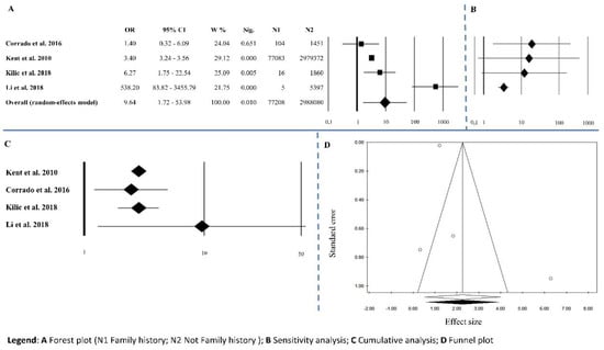 Family history of abdominal aortic aneurysm (AAA). (A) Forest plot (N1 Family history; N2 Not Family history); (B) sensitivity analysis; (C) cumulative analysis; (D) funnel plot.