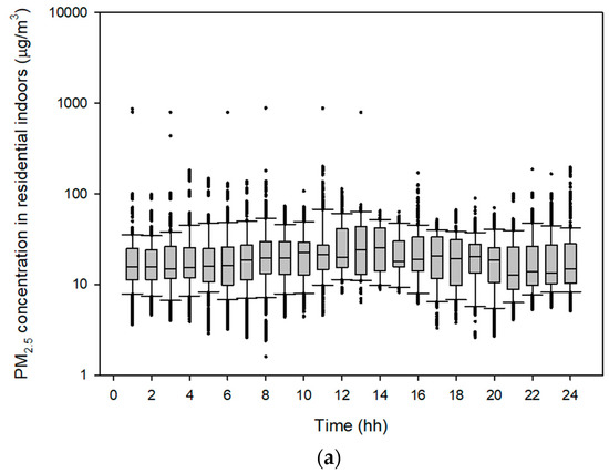 The residents of Seoul surveyed in this study spent 58.3% of their time in residential indoor environments, which was a similar proportion to that of the whole Korean population on weekdays (59.3%) [31]. The time spent in residential indoor environments by the citizens of Hong Kong (58.0%) was similar to that of Koreans [32]. Compared to western countries, Koreans spend less time in residential indoor environments [33,34,35,36,37,38]. A study conducted in the United States showed that Americans spent 70.9% of their time in residential indoor environments [39].