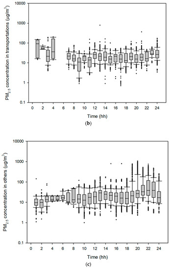 The hourly PM2.5 concentrations differed among microenvironments. The microenvironments used in this model were classified into only three categories because the time-activity patterns of the national Time Use Survey had the three microenvironments. The Time Use Survey was conducted for economic activity. Although microenvironmental classification is limited, application of national data for environmental study is significant. There was little variation in hourly PM2.5 concentrations in the residential indoors microenvironment, wherein the PM2.5 concentration was high at lunch time (12:00–12:59). In the “other” microenvironment category, the PM2.5 concentrations were high in the evening and at night time (18:00–22:59). This was because this category included restaurants and bars. The microenvironmental PM2.5 concentration in the residential indoors category was similar to that in the transportation category. Some studies have reported a higher PM2.5 concentration in the transportation versus residential indoor microenvironment category [28,29,30]; in our study, this was probably because walking was included within the transportation category. The Time Use Survey since 2014 classified the microenvironments as follows: Own home, workplace/school, restaurant, other, walk, private transportation, and public transportation. Future studies could apply this approach with more diverse microenvironments.