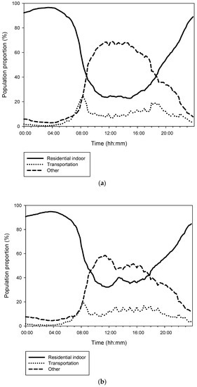 - Yang, W.; Lee, K.; Yoon, C.; Yu, S.; Park, K.; Choi, W. Determinants of residential indoor and transportation activity times in Korea. J. Expo. Sci. Environ. Epidemiol. 2011, 21, 310–316. [Google Scholar] [CrossRef] [PubMed]
