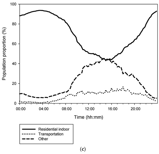 Time–activity patterns of the surveyed residents of Seoul on (a) weekdays, (b) Saturdays, and (c) Sundays.