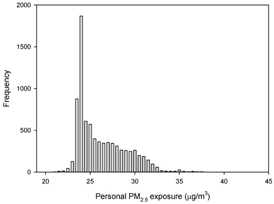 The individual exposure levels of the 8072 residents of Seoul were calculated based on their time–activity patterns and the PM2.5 concentration measured in each microenvironment at the time. The mean personal PM2.5 exposure level of the 8072 residents was 26.0 ± 2.7 µg/m3. However, this might have been an underestimation; microenvironmental concentrations were measured only when ambient PM10 concentrations were below the air quality standard of 100 µg/m3 (24-h average). Korean PM2.5 air quality standard was not available when the air quality was measured. In addition, measurements were taken with the aim of avoiding smokers where possible, in both indoor and outdoor environments. The main reason for calculating the personal exposure of the 8072 residents was to determine the factors associated with their exposure levels. The mean ambient PM10 concentration during the study period was 34.8 ± 18.0 µg/m3. Because the Korean government only began measuring PM2.5 in 2015, PM2.5 data could not be obtained for the study period.