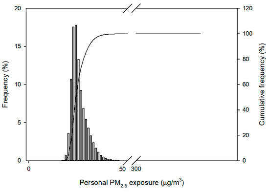 Population exposure to PM2.5 was simulated according to the PM2.5 concentrations at each time interval. After 10,000 simulations, the mean population exposure to PM2.5 of the 8072 surveyed residents of Seoul was 25.5 ± 4.0 μg/m3 (range: 15.0–328.5 μg/m3; median = 24.5 µg/m3; 95th percentile = 33.2 µg/m3, 99th percentile = 37.9 µg/m3). The simulated personal PM2.5 exposure levels are shown in Figure 4.