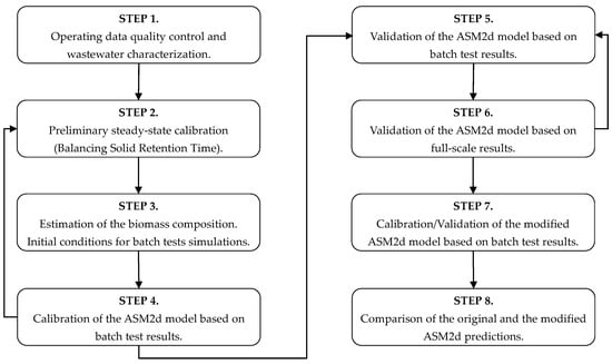 Laboratory tests were carried out by using activated sludge from the bioreactor of the Debogorze WWTP, and actual settled wastewater (SWW) from the average daily time-proportional sampler. According to the procedure described in the literature [15], two kinds of wastewaters were used: SWW without any pretreatment and pretreated with coagulation–flocculation (C–F) method. The wastewater pretreated with the C–F was prepared following the procedure described in the literature [16]. This wastewater only contained the soluble organic fraction. Both wastewaters were used to carry out different types of laboratory batch tests in order to determine the oxygen uptake rate (OUR), ammonia uptake rate (AUR), nitrate uptake rate (NUR), phosphorous uptake rate (PUR), and phosphorous release rate (PRR). The original and the modified ASM2d models were calibrated using results obtained from the batch tests carried out with the SWW [17,18]. The same set of model parameters were further evaluated using steady state data from Debogorze WWTP to compare predictions of the original and the modified ASM2d models at Debogorze WWTP. Organization of the modeling is presented in Figure 1.