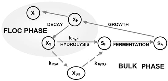 The modified ASM2d used in this work considered a two-step hydrolysis process with two rates (khyd, khyd,r), includes a new component (XSH), defined as the substrate readily hydrolysable and three new hydrolysis processes of XSH carried out under aerobic, anoxic and anaerobic conditions. A scheme of the hydrolysis concept is presented in Figure 2.