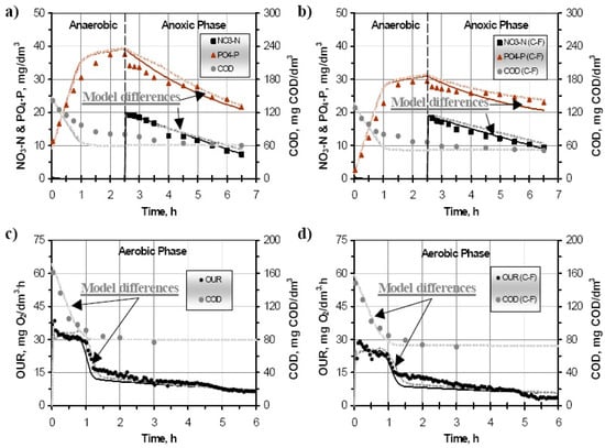 The application of the C–F method removed the colloidal and particulate COD fractions from the SWW. This removal resulted in processes rates reduction ranging in most of the cases from 10–60%. Similar results were previous obtained and reported in the literature [11]. The comparison of both examined models’ predictions vs. sample results of principal processes are presented in Figure 3. The ASM2d predictions were calibrated to the experimental NURs tests by fitting two parameters: the maximum growth rate of heterotrophs (μH) and hydrolysis rate constant (kh). No further fitting were required to calibrate the NUR in the anoxic stage of the PRR/anoxic PUR test (Figure 3a,b). Six parameters were fitted to calibrate the PRR and PUR tests. These parameters were the rate constant for storage of PHA (qPHA), half saturation coefficient of SA for PAOs (KSA, PAO), polyphosphate saturation coefficient for PAOs (KPP), the reduction factor of the anaerobic hydrolysis (ηfe), and particulate COD saturation coefficient (KX). The nitrogen removal process, based on the PRR and the PUR batch tests, was calibrated fitting the maximum growth rate of autotrophs (μA) and the NH4-N saturation coefficient (KNH4,A). The critical step of OUR batch test fitting was to adjust average values of both stoichiometric and kinetic parameters in the modified ASM2d. To do this fitting, 10 different scenarios were evaluated. The initial ARD were determined, being the ARD of the COD profile lower than 15% in all the cases, whereas higher ARD were obtained when predicting the OUR values which presented values up to 45%. The very high ARD in the OUR parameter could be explained because of the low consumptions rates, about 0.02 g g−1 VSS h−1, which lead to high ARD even when the absolute variations were small [20]. In order to reduce these errors, the OUR predictions were optimized by using the Nelder–Mead method [21]. Finally, using equal sets of model parameters from previous batch tests, the modified ASM2d were further evaluated by steady state and dynamic simulations of OUR batch test (Figure 3c,d).