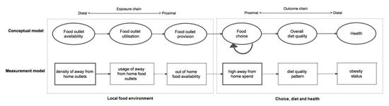 Empirical studies examining the local food environment and health often include the implicit assumption that a direct and independent effect on behaviour exists. However the influence of the density of away from home food establishments on food choice might be more accurately theorised as one distal environmental exposure on a causal chain that includes a range of intermediate exposures and outcomes. In combination these factors along the exposure chain provide the structural conditions needed for the frequent utilisation of away from home food establishments, followed by exposure to the food provision within outlets and subsequent food choice (see Figure 1) [14]. It is then through repeating these food choices over time that a dietary pattern emerges that can ultimately influence health.