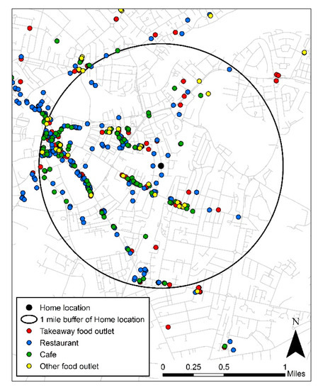 Using a geographic information system (ArcGIS 10, ESRI), relative away from home food establishment density was calculated for each household. Relative density is theorised as a spatial metric representing the intensity of exposure to features of the local food environment [33], and consistent with the focus on examining the role of density of away from home food establishments for this analysis [10]. Food outlet counts (away from home and other food outlet types) were made within a 1 mile Euclidean (straight line) radius buffer, centred on household addresses provided through UKHLS secure data access (see Figure 2). This distance is based upon previous work suggesting a behavioural relevance to food shopping among UK adults [34]. Relative density for each household was then calculated as the sum of the count of away from home establishments divided by the count of all food sources, divided into quintiles. Q1 represented those with the lowest proportion of away from home food outlets and Q5 representing those with the highest proportion.
