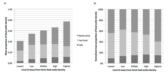 (a) Stacked weighted mean % of food outlet density by quintile of away from home exposure for each food outlet type; (b) Normalised contribution of weighted mean % food outlet density for type of food outlet by proportion of away from home exposure quintile.