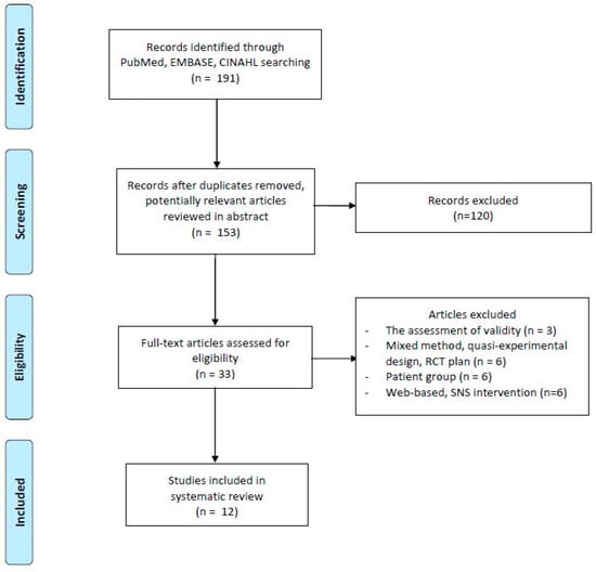A flow diagram for the study selection process is shown in Figure 1. The database searches produced 153 records after removal of duplicates. One hundred twenty items were excluded (e.g., review articles, qualitative studies, patients with a specific disease, using only SMS or web-based intervention (n = 85), no health promotion programs (n = 35)). After reviewing the abstracts, 33 full-text versions of studies were selected for further assessment of eligibility. Twenty-one of them were excluded because they failed to meet the inclusion criteria: the assessment of mobile-app validity (n = 3); mixed method, quasi-experimental design, RCT plan (n = 6); patient group (n = 6); and web-based, SNS intervention (n = 6). This led to the inclusion of 12 studies.
