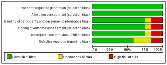 The risk of bias tool includes the domains of selection bias (random sequence generation, allocation concealment), performance bias (blinding of participants and personnel), detection bias (blinding of outcome assessment), attrition bias (incomplete outcome data), and reporting bias (selective reporting). Each risk of bias was classified as low risk, unclear risk, and high risk of bias.
