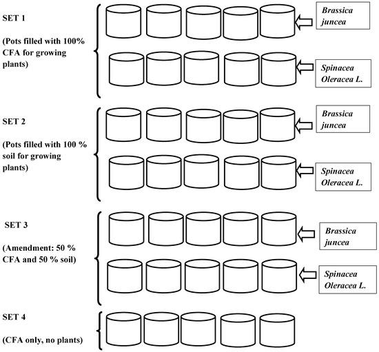 The dry CFA used was collected from a selected South African coal-fired power utility. Good and viable seeds of Spinacia oleracea L. and Brassica juncea were purchased from a local store, sown in seed trays, and, thereafter, transplanted to pots for the growth experiments.