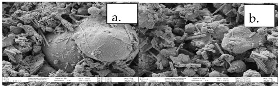 Scanning electron microscopy (SEM) micrographs of selected South African coal-fired power-utility coal fly ash (CFA) at (a) ×20,000 and (b) ×30,000 magnifications.