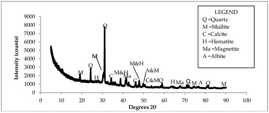 Figure 3 presents the XRD spectrum of the CFA. The spectra showed the presence of mullite, quartz, calcite, hematite, magnetite, and albite as mineral phases in the CFA. Quantitative results from XRD showed that mullite was the dominant mineral (48.14%), followed by quartz (28.51%). Other mineral phases were at trace levels.