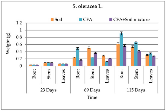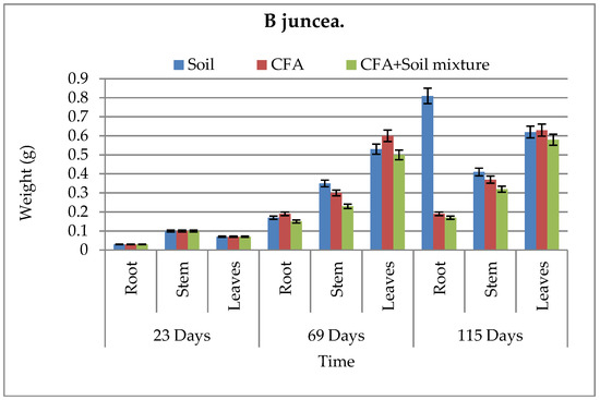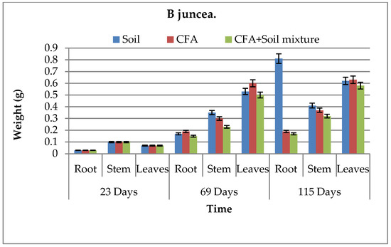 The biomass and growth performance of B. juncea and S. oleracea L. over time in different growth media are presented in Figure 4, Figure 5, Figure 6 and Figure 7, respectively. Results showed that, in both growth media, the root, stem, and leaf biomass of B. juncea and S. oleracea L. plant species increased with increasing number of days. Based on the root and stem mass, S oleracea L. showed better tolerance in CFA as compared to B. juncea in CFA growth media. It is, therefore, anticipated that S. oleracea L. would yield better performance in phytoremediation because plants with extensive roots are capable of extracting more chemical species due to better exploration of growth media [13]. Furthermore, S. oleracea L. showed better growth in CFA media, while B. juncea grew better in the soil as a growth medium.