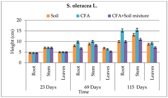 It was observed that chlorophyll a and b increased during the first 69 days and declined in 115 days for some of the growth media (Table 2). This was observed in both plant species. Goswami and Das reported similar findings, where there was significant reduction in the total chlorophyll content of the young leaves of B. juncea and B. napus on exposure to 10 mM Cd for 15 days [11]. Compared to B. juncea, S. oleracea L. showed better chlorophyll b content. Even though that is the case, B juncea showed to have more survival characteristics by having some carotenoid content while S. oleracea L.’s was not detected (Table 2). This carotenoid content in B. juncea plants can help in the protection of the plant species and improve its tolerance to harsh environments, including the high amounts of chemical species found in CFA; hence, it can promote its effectiveness in phytoremediation better than S. oleracea L. In an excess of light, carotenoids play an important role in photoprotection, and also have ecological significance [22]. Carotenoid content also protect plants against overexcitation in strong light, and dissipates excess absorbed energy; carotenoids scavenge reactive oxygen species formed during photo-oxidative stress and moderate the effect of extreme temperatures [23]. However, statistically, there was no significant difference between the two plant species in terms of growth performance and biomass, even between the plant parts denoting similar growth performance for the two plant species under study. This was because the P values for both species relative to the three different sets of growth media were greater than 0.05, hence showing no significant difference. These statistical results confirm that the little difference we saw in Figure 4, Figure 5, Figure 6 and Figure 7 was just not significant enough to have an effect on the biomass and growth performance of the plants under study. This might have been influenced by similar characteristics that the two plant species host, and the similar characteristics possessed by the soil and CFA used as the growth media for the pot-culture experiments.