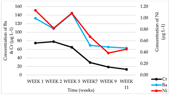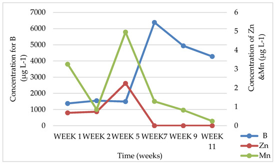 The temporal variation of the chemical elements in the leachates from different growth media is based on results for leachates collected from the first to the eleventh week of the pot-culture experiments for the different growth media. The full analysis results are presented in the supplementary information in Tables S1–S7. The selected chemical species presented include B, Cr, Mn, Ni, Cu, Zn, Mo, Ba, and Fe. They were chosen based on their higher concentrations in the leachates. Several authors have also indicated that these chemical species were present in CFA leachates in higher concentrations [8,12,24].