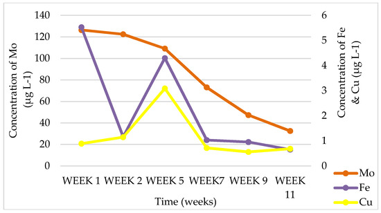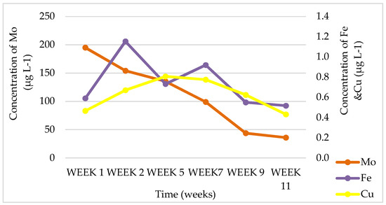 In batch-leaching tests, soil leachates had a neutral pH of 7.22 with very high amounts of Si CFA leachates, meanwhile, had an alkaline pH of 10.62, which is known to be due to low sulfur content [14,25,26,27], and this can be seen in Table 1. In both soil and CFA, chemical species that were expected to be readily available to plants included Ca, Si, K, Ba, Mo, Na, Al, Mg, and Sr, where Si, Ba, Na, Al, and Sr are nonessential elements as they were found in leachate solutions, which, if uptaken by plant roots, can have a negative impact on the plants. Physicochemical analysis of the soil, CFA, and CFA + soil leachates where plants were grown and where there were no plants showed that the alkalinity of the CFA changed over time (starting from an average of 9.4 to 7.5 pH level in the 11th week) and there was also a decrease in the EC (starting from an average of 411 to 224 µS cm−1 in the 11th week) due to the dissolution of soluble major oxides, which was promoted by continuous irrigation with water. Chemical species like B, Cr, Mo, and Ba (ranging from 4277.50 to 13.04 µg L−1) occurred at higher concentrations in leachates for most weeks for CFA and soil + CFA as a growth medium, while Fe (starting from 10,003.41 to 550.25 µg L−1 in the 11th week) was high for soil as a growth medium. It was observed that, in the 11th week of leachate collection, all these chemical species plummeted to very low concentrations. An example of the chemical elements that were found to be bioavailable in CFA leachate samples for S. oleracea L. can be seen in Figure 8, Figure 9 and Figure 10. This suggests that these chemical elements could be reduced over time as plants are irrigated, which is either due to uptake by plants, or being washed off with water and/or CFA weathering processes [14]. A similar trend was observed for CFA, soil, and CFA + soil growth media. There was a significant difference in the concentrations of different chemical species in leachates from different growth media for each plant species (B. juncea and S. oleracea L.).