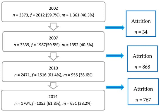 We used data for the 12-year period, 2002–2014, and analyzed the 18–29 age group. In 2002, our age group comprised 3373 persons, 2012 women (59.7%) and 1361 men (40.3%), equaling a response rate of 53.9%. For the following surveys, see Figure 1. As a non-response analysis was not available we were able to comment on the attrition characteristics.