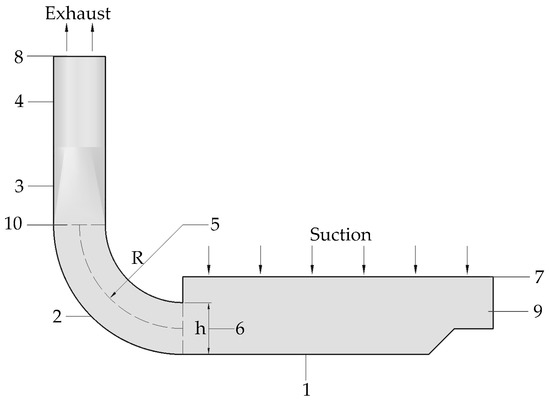 Model components and positional relationship between R and h. 1—Inlet hood; 2—rectangular elbow; 3—reducer; 4—duct; 5—radius of curvature R; 6—rectangular section height h; 7—suction boundary; 8—exhaust boundary; 9—XOZ section; 10—XOY section.