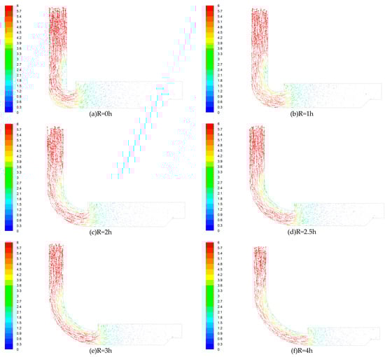 As shown in Figure 4, in the elbow exit section with R = 0 h, the wind velocity close to the inner wall surface is low, and the wind velocity close to the outer wall surface is relatively large. The distribution of wind velocity is extremely uneven. The wind velocity uniformity at the elbow with R = 1 h is significantly improved when compared to the elbow with R = 0 h, but the wind velocity close to the inner wall surface is still much smaller than the wind velocity close to the outer wall surface. From R = 1 h to R = 4 h elbow, the wind velocity difference became smaller and smaller, and the section wind velocity uniformity was obviously improved.