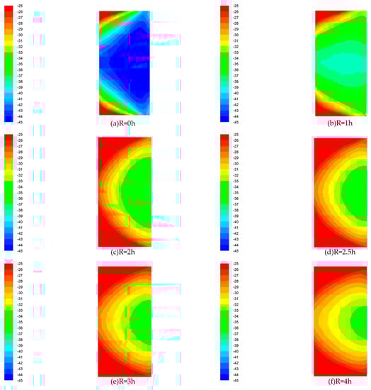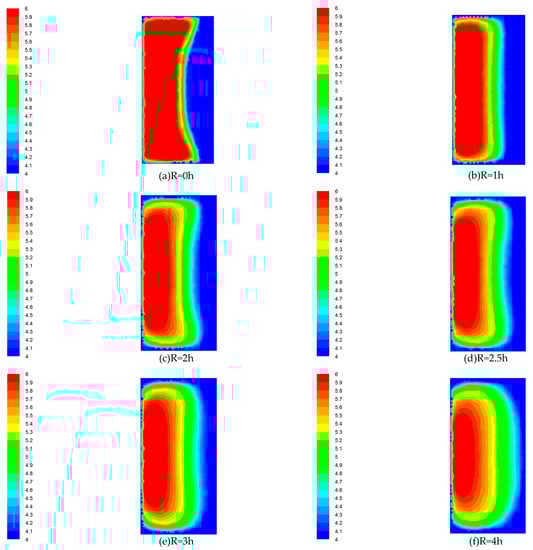 Pressure distribution cloud. (a) R = 0 h; (b) R = 1 h; (c) R = 2 h; (d) R = 2.5 h; (e) R = 3 h; (f) R = 4 h.