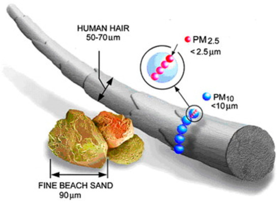 PM is classified based on its aerodynamic diameter, which is the main criterion for determining its ability to transport in air and penetrate the human body [14]. PM includes PM10, with an aerodynamic diameter 10 μm or less; fine aerodynamic particulate is defined as PM2.5 of 2.5 μm or less in diameter, and ultrafine particles (PM0.1) are categorized as extremely small, less than 0.1 μm in diameter [11,12,15]. The sizes of PM10 and PM2.5 can be compared to the diameters of fine beach sand (90 μm) and human hair (70 μm), respectively (Figure 1). PM10 (coarse PM) is known as inhalable particles that can penetrate into the respiratory tract (e.g., trachea, deep lungs, and bronchi) [14,16,17]. The coarse fraction of PM10 generally originates from construction and demolition operations, paved and unpaved roads, industrial processes, and agriculture as well as biomass burning [14,18]. On the other hand, PM2.5 can be emitted directly from the combustion of vehicles, industry, smokestacks, fires, and via atmospheric reactions of gases (e.g., NOx and SO2) [12,14,18], PM2.5 can easily enter the alveolar region of the lung [16,17,19,20]. At bus stations, PM2.5 is particularly problematic, because waiting passengers can be easily exposed to this particulate as generated by the fuel burning process in vehicles (e.g., motorcycles, trucks cars, buses, and heavy-duty vehicles). [16]. According to a report of the World Health Organization (WHO) (2003) on PM in Europe, the annual average mass concentrations of both PM10 and PM2.5 are mainly contributed by sulfates, organic matter, nitrate, and black carbon [13].