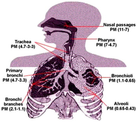 Potential for deposition of particles of different sizes [19]. “Reproduced with permission from Kim et al. (Environment International; published by Elsevier, 2015)”
