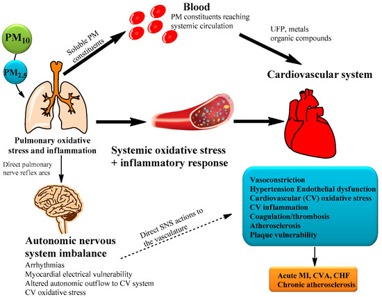 Biological pathways which PM can cause cardiovascular disease (CVD) [43]. (UFP: Ultrafine particle, MI: Myocardial infraction, CVA: Cerebrovascular accident, and CHF: Congestive heart failure).