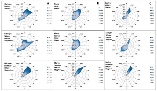 Wind speed increases annually in winter and summer seasons for (a) Goztepe, (b) Florya, and (c) Sariyer in Istanbul and their effects on classified PM10 levels [68]. “Reproduced with permission from Unal et al., (Atmospheric Environment; published by Elsevier, 2011)”.