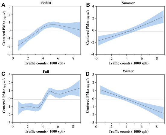 The effects of traffic factors on PM concentration have been determined by various methods. Zhang and Batterman (2010) used generalized additive models to estimate vehicle contributions to PM pollution near roadways [72]. They indicated that traffic count was in a positive relationship with PM2.5 concentration rise at points near the road (Figure 7).