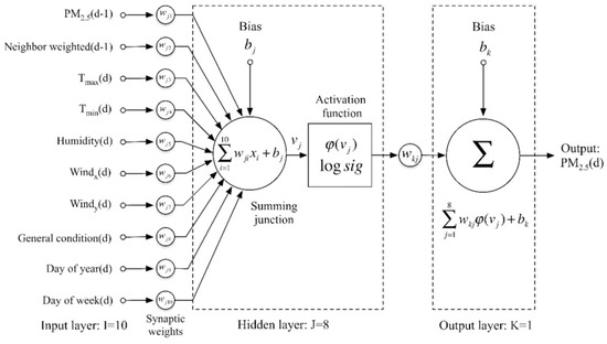 In fact, in a study of Feng et al. (2015), the MLP type of back-propagation neural network was applied to forecast PM2.5 pollution based on respective pollutant predictors as well as meteorological forecast variables as input data [88]. In this study, 85% of data was set for training, and the remaining data was used for testing. There were 10 variables in the first layer, as shown in Figure 9 (PM concentration, temperature max and min, wind, humidity, neighbor weighted, general condition, month of year, and day of week), and the prognostic predictors (wind, temperature, and humidity) were extracted from the predicted values published by meteorological authorities instead of real-time values. The hidden layer of this neural network contained 8 neurons that can obtain the best validation data for an optimal MLP structure. It has been reported that with the high daily level of PM2.5 in China, applications of this neural network can achieve an average accurate prediction of 90% compared to real-time values of PM2.5 concentrations prevalent at the same time.