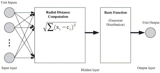 Radial basis function (RBF) also is an effective feed-forward neural network. Although less well-known than the MLP model, the main advantages of the RBF network are its affording of the minimum approximating error of any function as well as the global optimum, and its generally much faster training [83,89,90,91]. Therefore, it has been widely used in a considerable number of applications (e.g., classification, regression problems, function approximation, prediction, and signal processing) with good results.