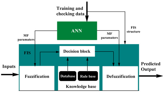 In addition, a FIS structure consists of three main components, including a rule base, a database, and a reasoning mechanism [96]. The rule base has enough if–then rules for the scope of input variables, while the database determines membership functions applied in fuzzy rules, and the reasoning mechanism is responsible for an inference procedure [96]. Besides, the ANN portion in this architecture can improve membership functions related to the FIS structure based on its training mode, according to a training and checking dataset [93]. The training process is based on a hybrid learning algorithm or a BP algorithm. The hybrid learning algorithm defines premise parameters with a gradient method and consequence parameters with a least square model. With the BP algorithm, error signals are transmitted back, and new premise parameters are calculated using the gradient method.